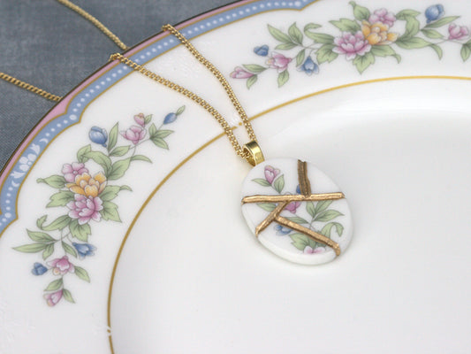 Discover the beauty of resilience with our handcrafted Kintsugi pendants. Each pendant is created from a porcelain plate, intentionally broken and carefully repaired by hand.